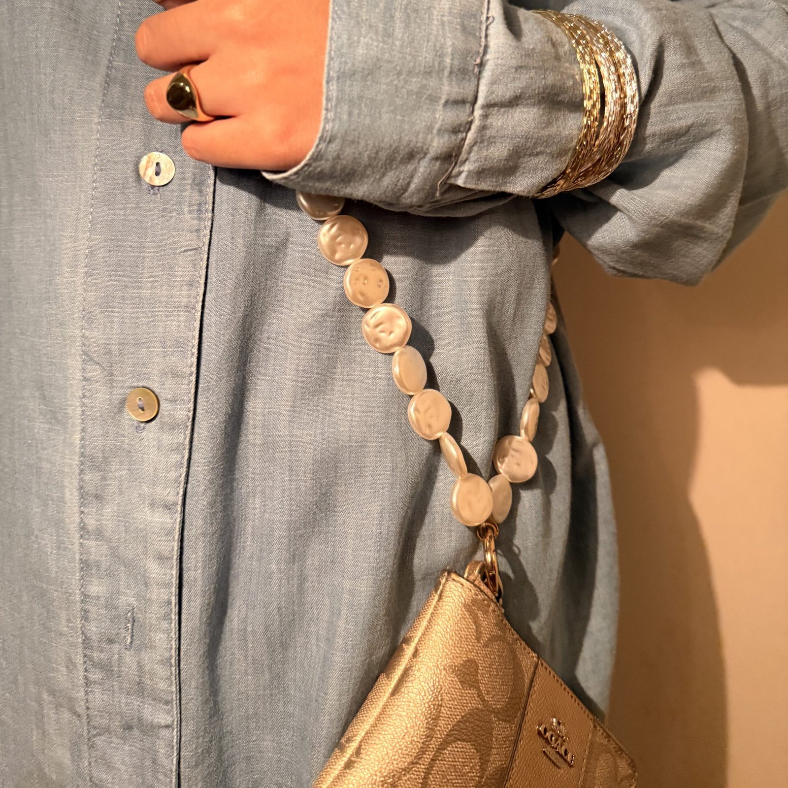 A Piece of the Moon. Crafted with *finest quality coin pearls*, this handmade piece captures the soft glow of moonlight in every curve. Flat, luminous, and perfectly radiant, each pearl reflects a quiet elegance that feels both delicate and powerful. Designed to be worn your way, as a bag charm, phone sling, or a statement necklace that completes your look. Timeless, graceful, and celestial 🌙✨