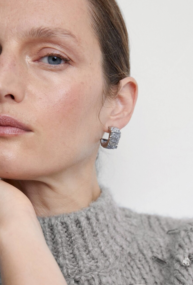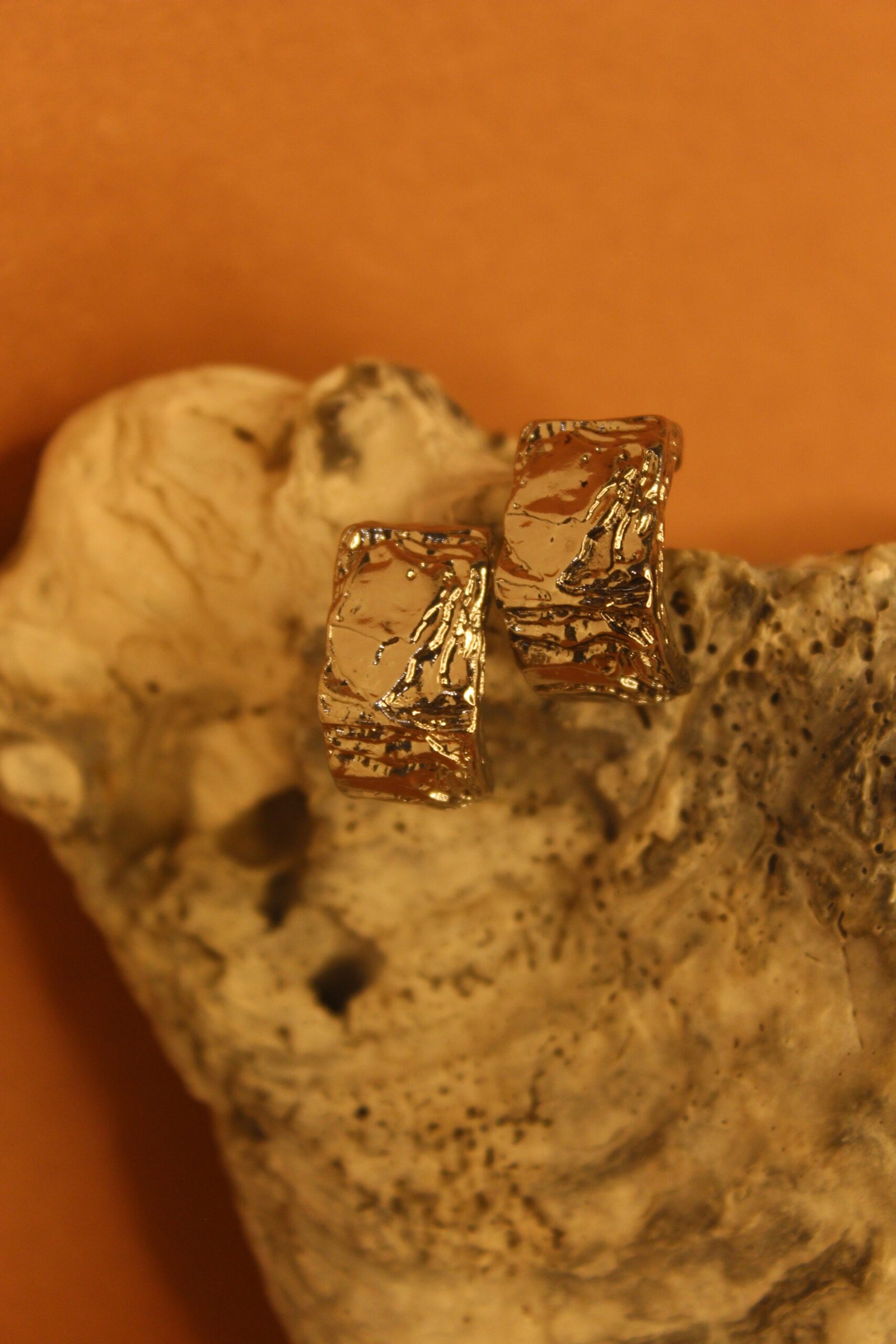 Silver Armor Strength sculpted in metal. A bold statement of resilience, the Armor hoops feature a thick, rugged silhouette with a heavily distressed, molten texture. Designed to look like weathered metalwork, these earrings offer a powerful, protective aesthetic that feels both ancient and futuristic. Available in both 18k gold plating and sleek silver. Silver: A cool, industrial finish for a modern, warrior-inspired look. Raw texture. Heavy metal aesthetic. Wear your armor.